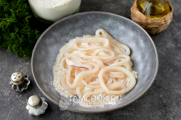 В глубокую миску всыпьте муку, посолите ее и поперчите, обваляйте кольца кальмаров в этой смеси. Думаю, что с кукурузной мукой тоже должно получиться вкусно. Также при желании в муку можно всыпать немного любимой приправы для морепродуктов или рыбы.