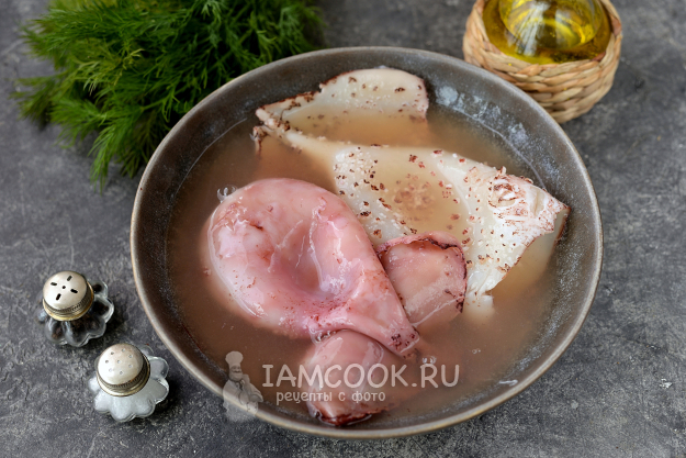 Переложите тушки в глубокую миску, обдайте кипятком. Не пропускайте этот шаг, поскольку на сковороде размороженные кальмары пустят воду и хрустящая корочка от муки не получится.