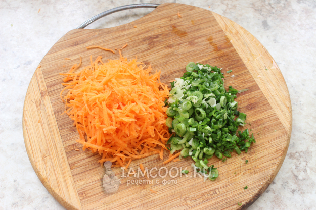 Лук и чеснок мелко нарежем, морковку натрем на терке.