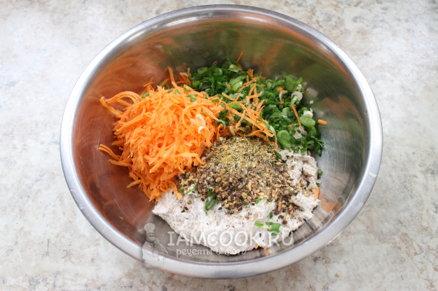 Соединяем в миске гречневую массу, морковку, лук, семена льна, соль и любимые специи. Семена льна - связующий элемент вместо яйца.
