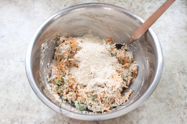 Хорошо перемешиваем, добавляем муку из зеленой гречки и еще раз перемешиваем. Масса для котлет должна получиться влажной, не тугой.