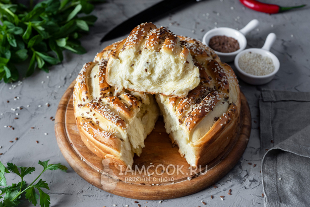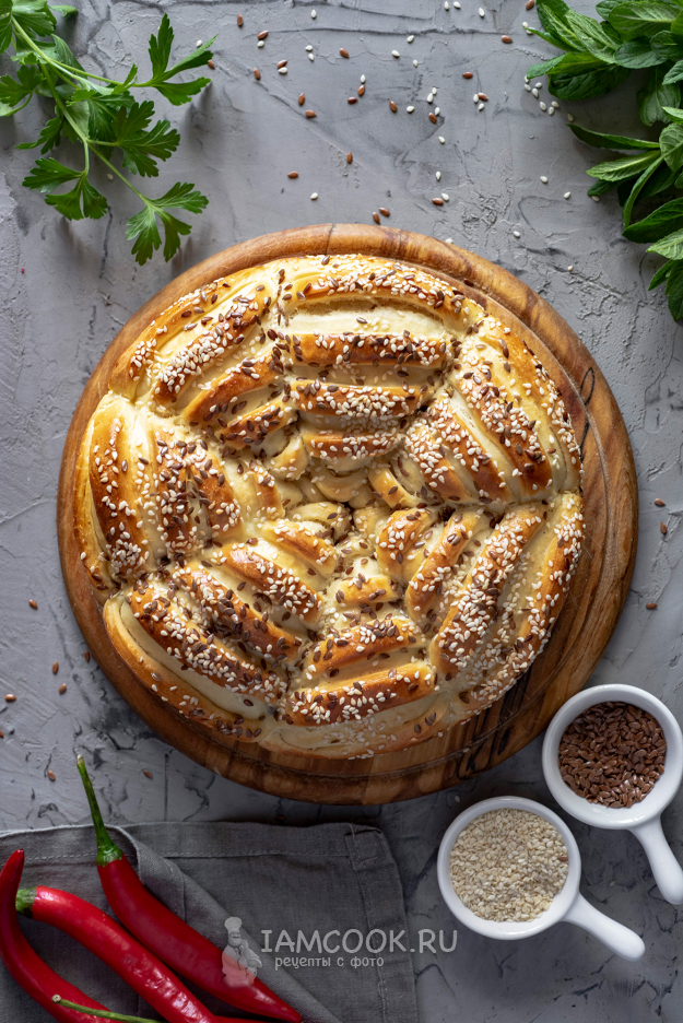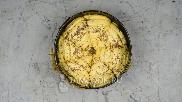 Взболтаем венчиком яйцо в миске и смажем полученной яичной смесью поверхность будущего пирога. Затем обсыплем кунжутом и семенами льна по желанию. Отправим будущий отрывной пирог с капустой в духовку, заранее разогретую до 180 градусов, на 40-45 минут.