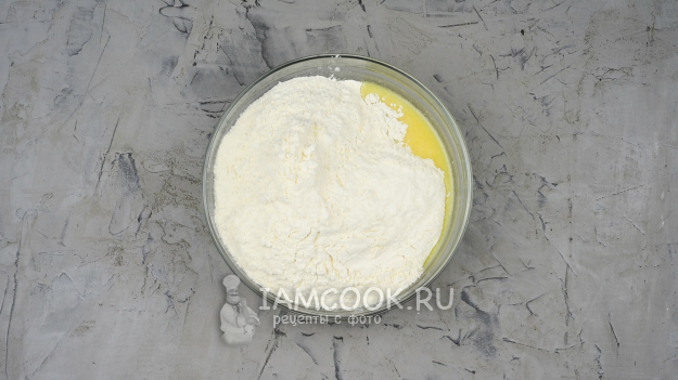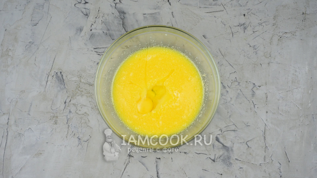 Зальем растопленное масло, добавим соль, вобьем яйцо. Перемешаем ингредиенты венчиком до получения однородной смеси.