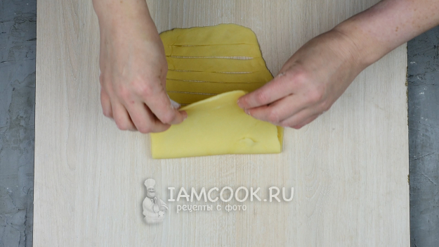Условно поделим раскатанное тесто на две части и одну часть порежем на ленты шириной примерно в 1 см, не дорезая ножом до края, как на фото.