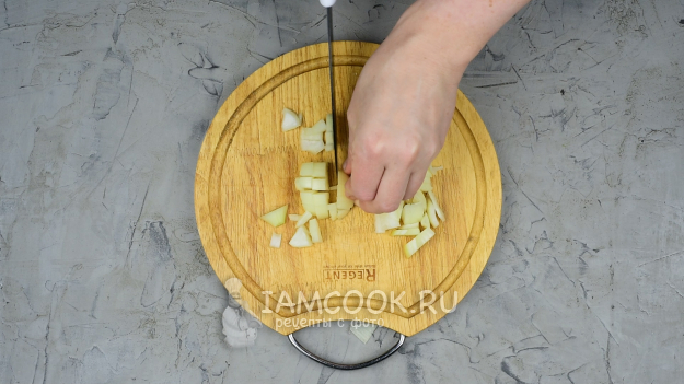 За это время приготовим начинку. Мелко нашинкуем луковицу.