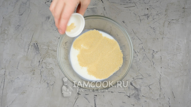 Приготовим тесто. В миску зальем теплое (35-37 градусов) молоко, добавим сахар и сухие дрожжи, перемешаем.