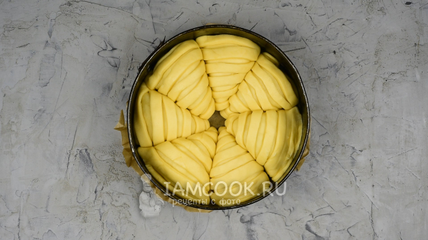 Затем сплошную часть теста (не порезанную) выложим на порезанную часть теста.