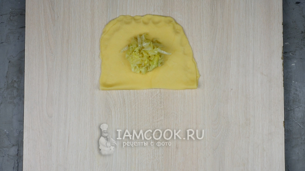 На середину полученной конструкции выложим 1-2 столовые ложки начинки из капусты.