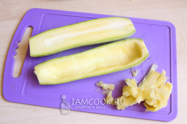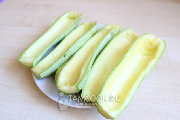 Кабачки тщательно моем, срезаем хвостик и попку, разрезаем вдоль на две части. Чайной ложкой аккуратно вычищаем внутренности (семечки) кабачков, оставляя достаточной толщины бортик.