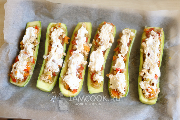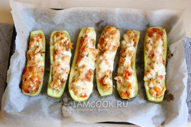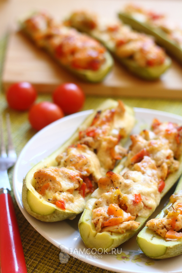 Лодочки из кабачков с куриным филе готовы! Подавать к столу можно как горячими, так и остуженными. Приятного аппетита!