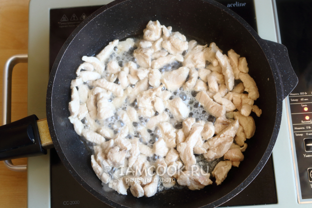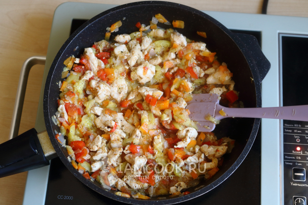 Сковороду разогреваем с растительным маслом, выкладываем куриное филе, обжариваем 2-3 минуты.