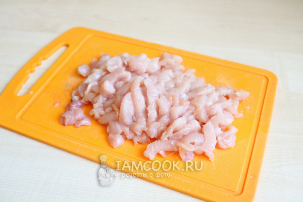 Готовим начинку. Куриное филе промываем и нарезаем мелким кубиком.