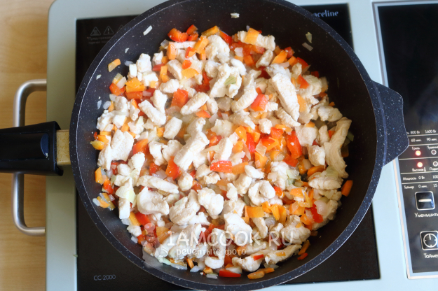 Выкладываем лук, морковь и перец и обжариваем ещё пару минут.