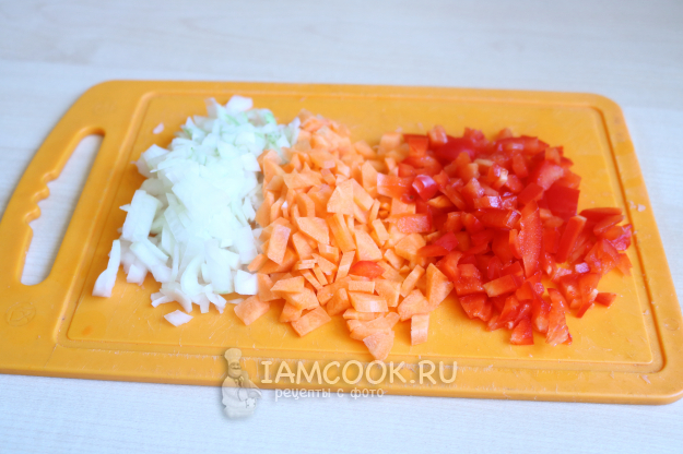 Лук, морковь, перчик нарезаем также мелким кубиком.