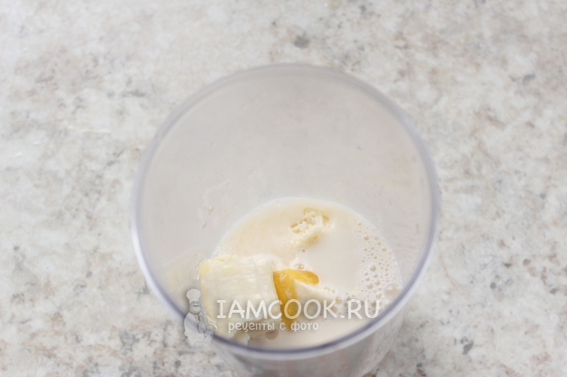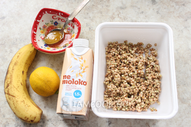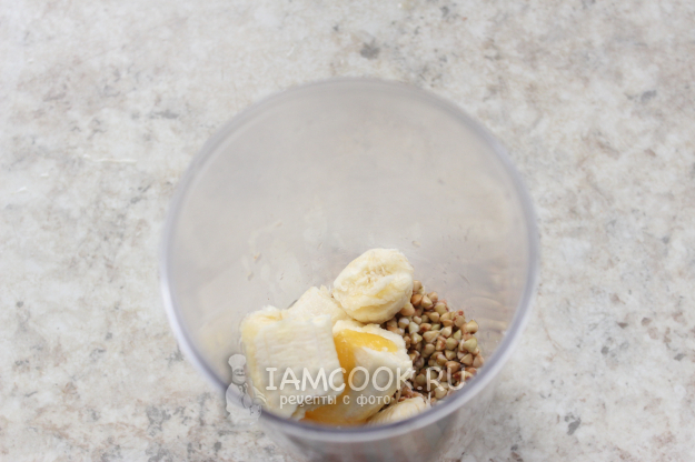 В чаше блендера соединяем гречку, очищенный банан, мед и немного лимонного сока.