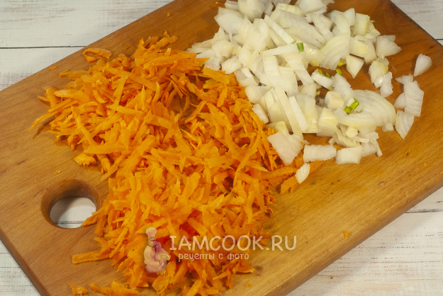 Лук и морковь почистим и подготовим для пассерования: морковку натрем, а лук нарежем мелко.
