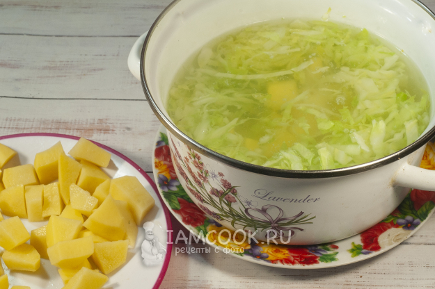 Добавим картофель к капусте, немного посолим (примерно 1 ч.л., можно с горкой). Позже, если нужно, досолим. Поставим вариться — после закипания огонь уменьшим и накроем кастрюлю крышкой. Варим примерно 25 минут с момента закипания.