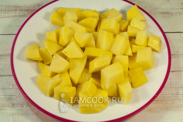 Начистим картофель, порежем кубиками.