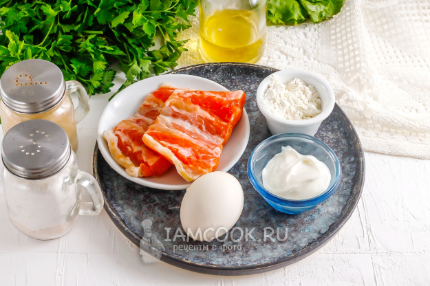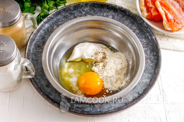 Вбейте в глубокую емкость куриное яйцо, всыпьте соль, молотый черный перец и пшеничную муку. Выложите сметану или майонез и тщательно все вымешайте венчиком или вилкой, не образовывая комочки.