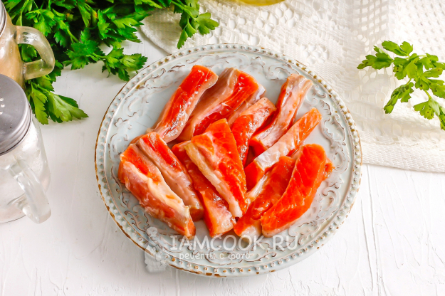 Подготовьте необходимые ингредиенты для жарки кижуча в кляре на сковороде.