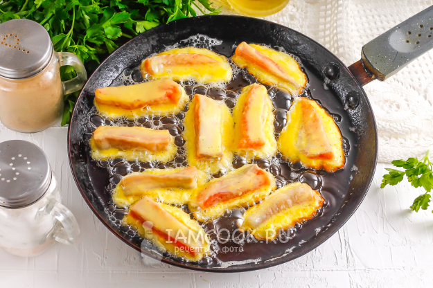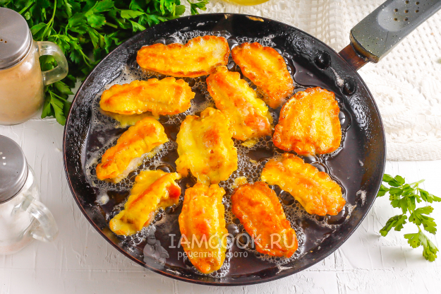 Каждый из кусочков посолите и обмакните в кляр со всех сторон.