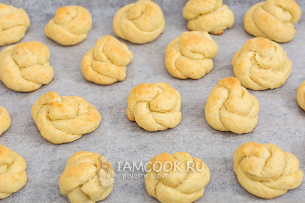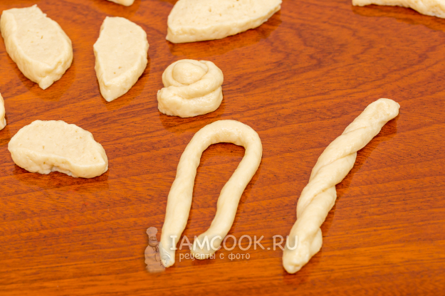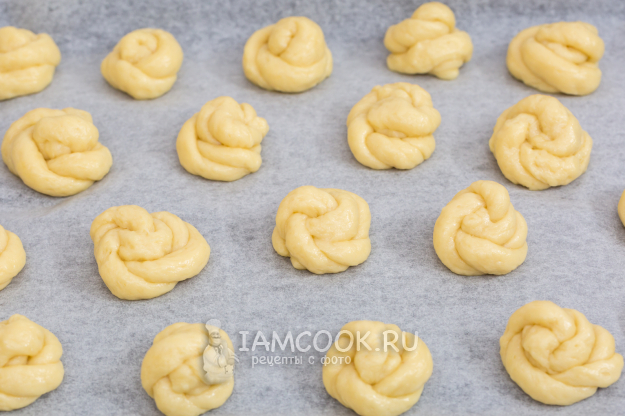 Полученное тесто разделите на 18-20 частей. Из каждой части скатайте жгутик, соедините концы и переплетите. Полученную косичку сверните в своеобразный пучок.