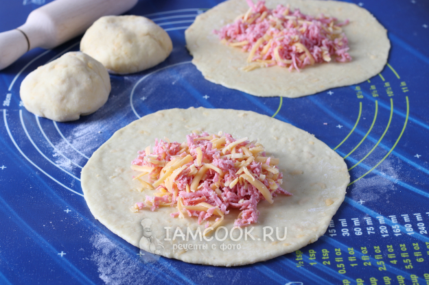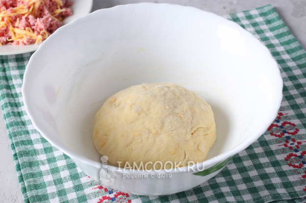 Добавить оставшуюся муку и замесить мягкое тесто, немного липнущее к рукам. Для начинки смешать колбасу и оставшийся сыр.