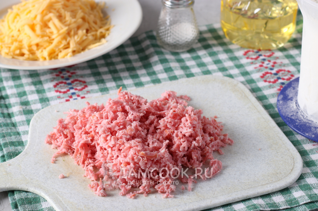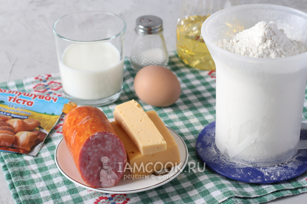 Для приготовления лепёшек с колбасой и сыром в духовке подготовить из списка необходимые ингредиенты.