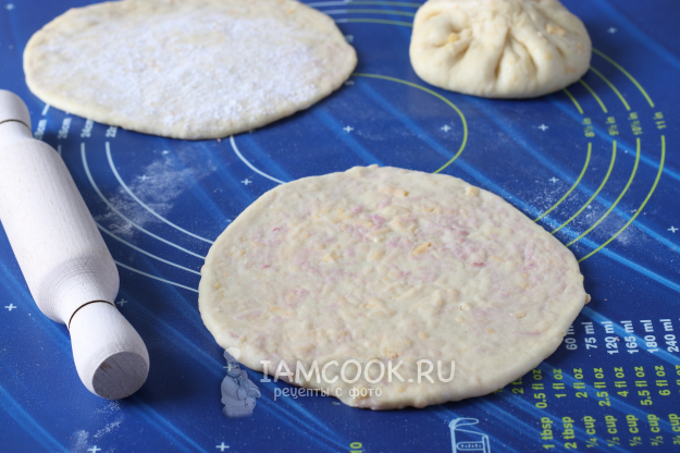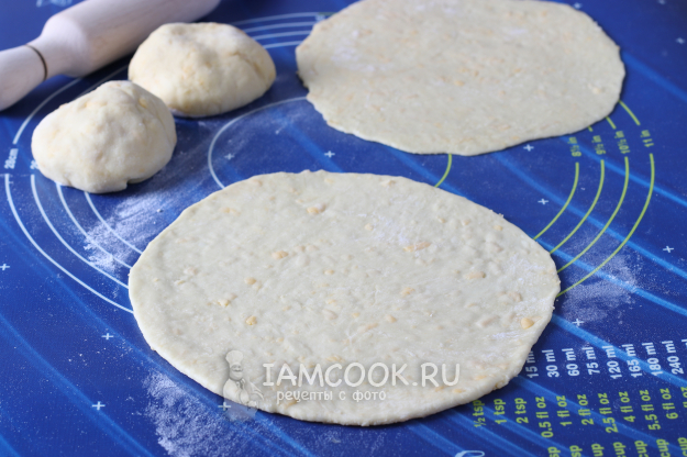 Собрать тесто в узелок, перевернуть швом вниз и снова раскатать в лепёшку.