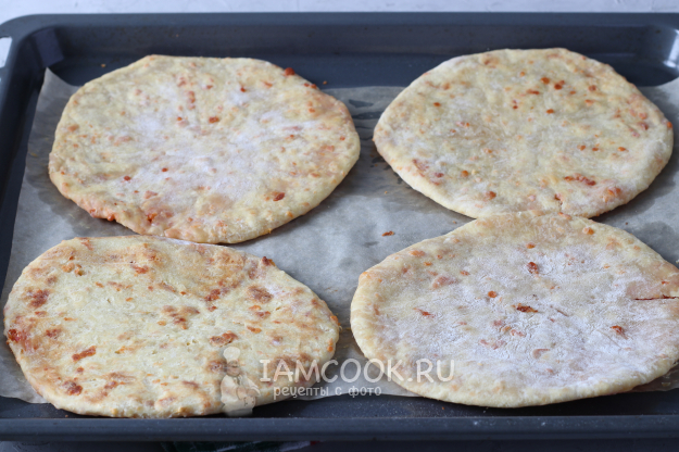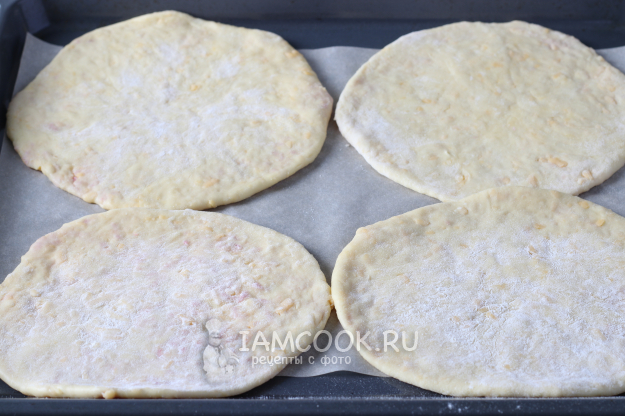 Таким образом сформировать сразу все лепёшки. Застелить пергаментом противень и выложить на него лепёшки.