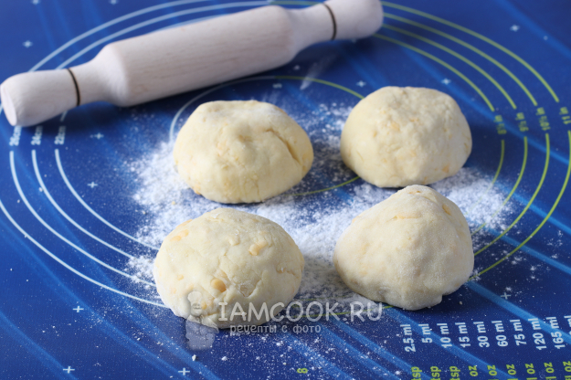 Рабочую поверхность присыпать мукой, тесто разделить на 4 равные части.