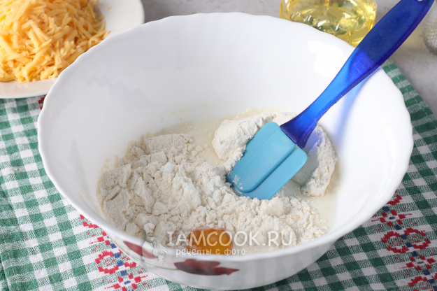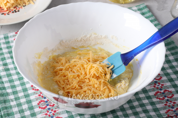 Добавить в тесто соль, масло и половину тёртого сыра, перемешать ещё раз.