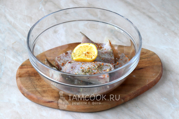 Подготовленные кусочки посолить, добавить приправу к рыбе и полить лимонным соком. Аккуратно перемешать и оставить на столе минут на 10, чтобы рыбка пропиталась специями.