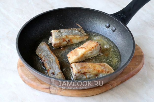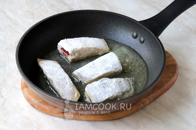 По истечению времени обвалять каждый кусочек в муке, лишнюю муку стряхнуть, чтобы при жарке она не подгорала, и выложить на сковороду с разогретым растительным маслом.