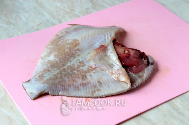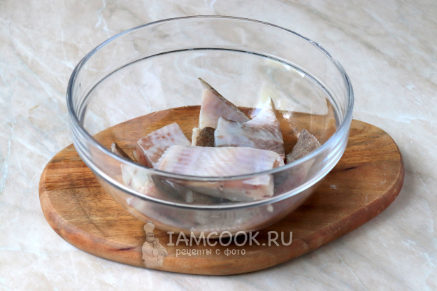 Разрезать камбалу на порционные кусочки и сложить их в миску.