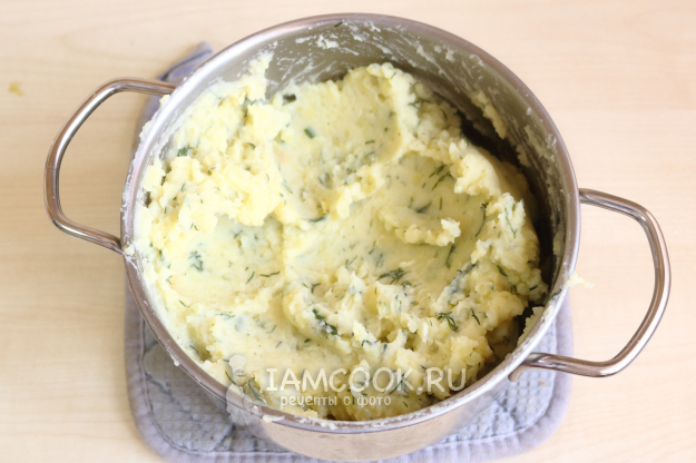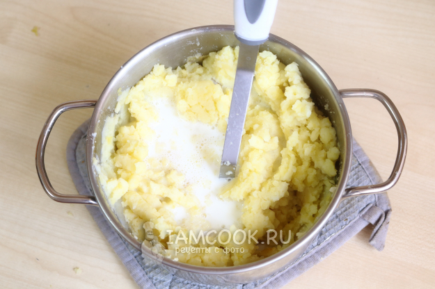 Помните картофель толкушкой, вливая понемногу горячее молоко (заранее доведите до кипения). Работайте толкушкой до желаемой консистенции пюре (с комочками или без).