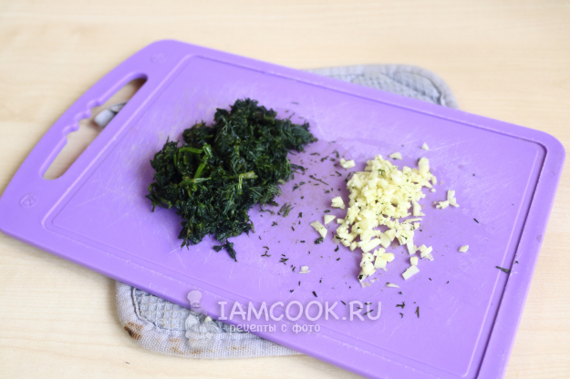 Для пюре измельчите ножом очищенный чеснок и свежий укроп. Зелень можно взять любую, а количество чеснока скорректировать по вкусу.