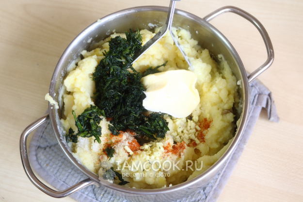 Затем добавьте в кастрюлю сливочное масло, измельчённые чеснок и укроп, специи: соль, чёрный молотый перец, красную паприку.