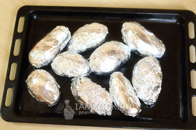 Картофель тщательно промойте, просушите и заверните каждый корнеплод в фольгу. Выложите на противень. Запекайте при 180 градусах до готовности (вилкой/ножом картофель должен легко протыкаться). В среднем процесс запекания займёт от 45 до 75 минут, в зависимости от параметров духовки и размеров картошки.