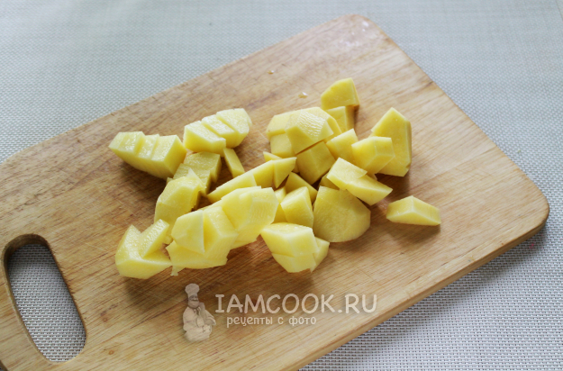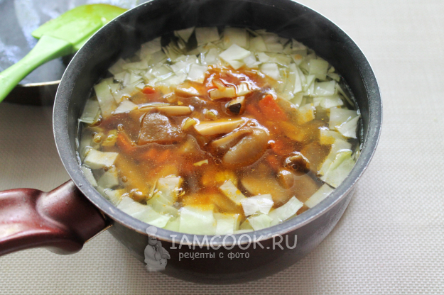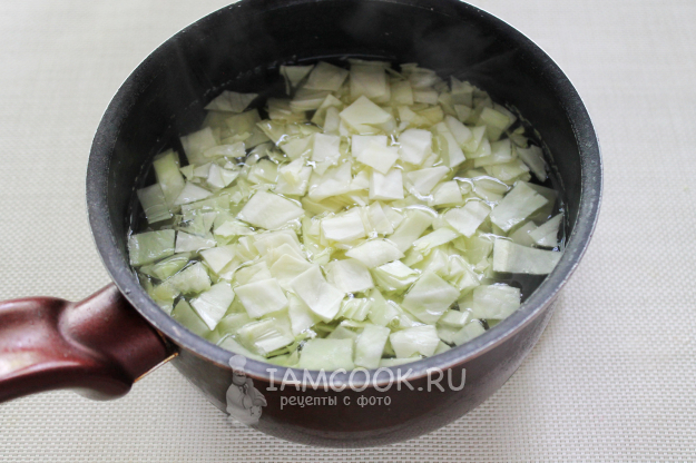 К сварившемуся в бульоне картофелю добавим нарезанную белокочанную капусту. Снова доведем до кипения.