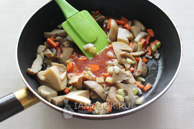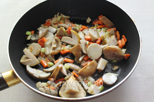 Добавьте грибную нарезку на сковородку к овощам и немного потомите в масле.