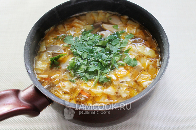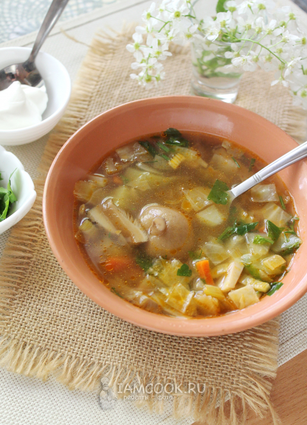 Очень вкусны щи с солеными грибами и свежей капустой, если к ним добавить сметану.