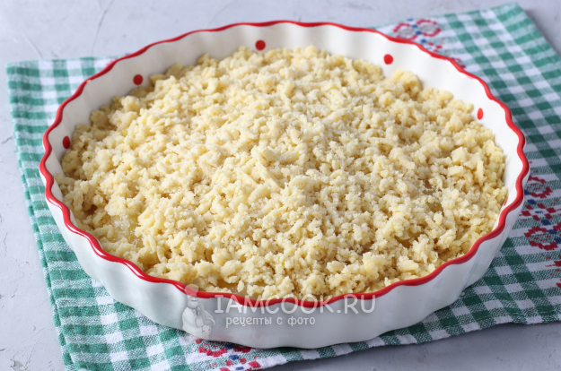 Достать вторую часть теста, натереть её сверху таким образом, чтоб она закрыла начинку.