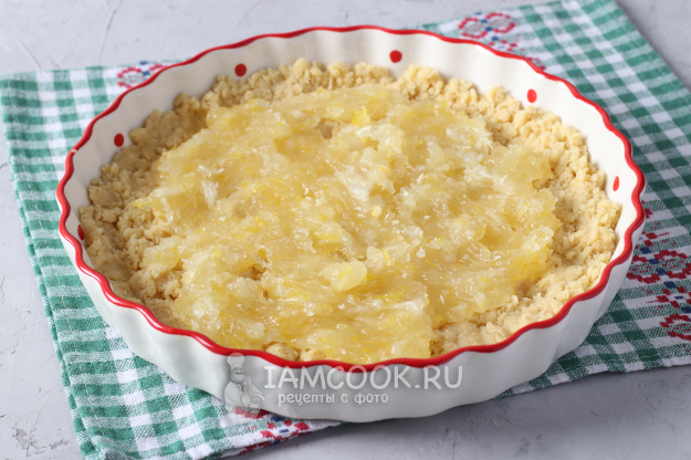 Достать из морозилки большую часть теста, натереть на крупной тёрке прямо в форме. Распределить всю крошку равномерно по форме и немного прижать к дну и бокам, формируя небольшой бортик. Сверху на тесто выложить лимонную начинку.