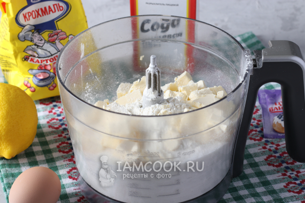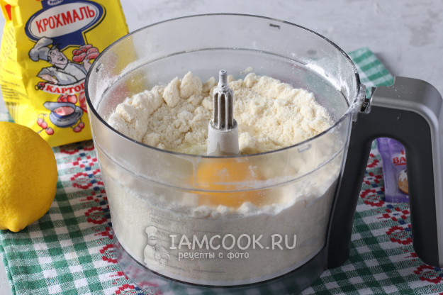 Соду погасить лимонным соком, добавить в крошку. Разбить в чашу яйцо и налить холодную воду. Включить комбайн ещё на несколько секунд, пока не образуется комковатая крошка. Долго месить тесто не нужно.