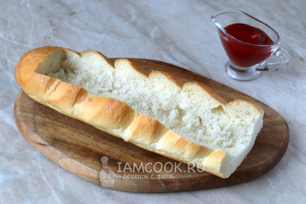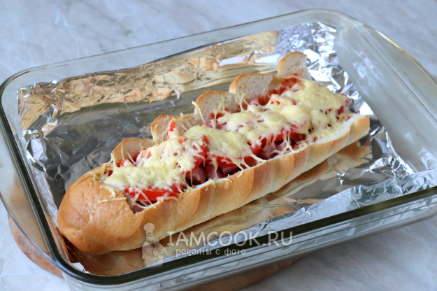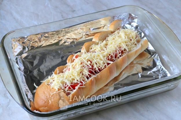 Возьмём багет (у меня был слишком длинный, поэтому я разрезала его на две части, чтобы поместился в форму для запекания), срежем с него верхушку и удалим мякоть, чтобы получилась своеобразная лодочка (как на фото).