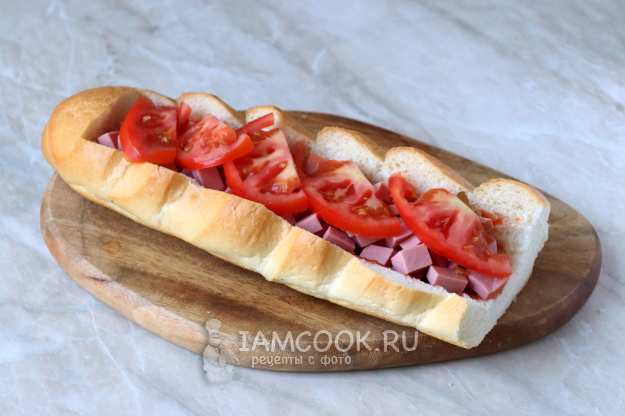 Помидор нарежем тонкими полукружочками и выложим поверх колбасы. Немного подсолим.