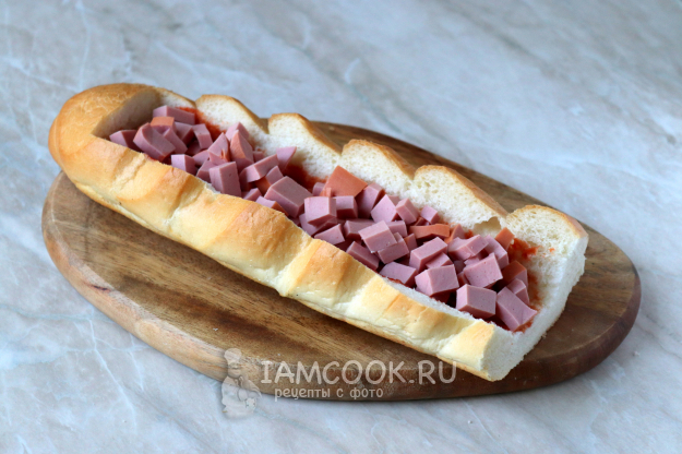 Колбасу нарежем кубиками или длинными полосочками и выложим внутрь батона.