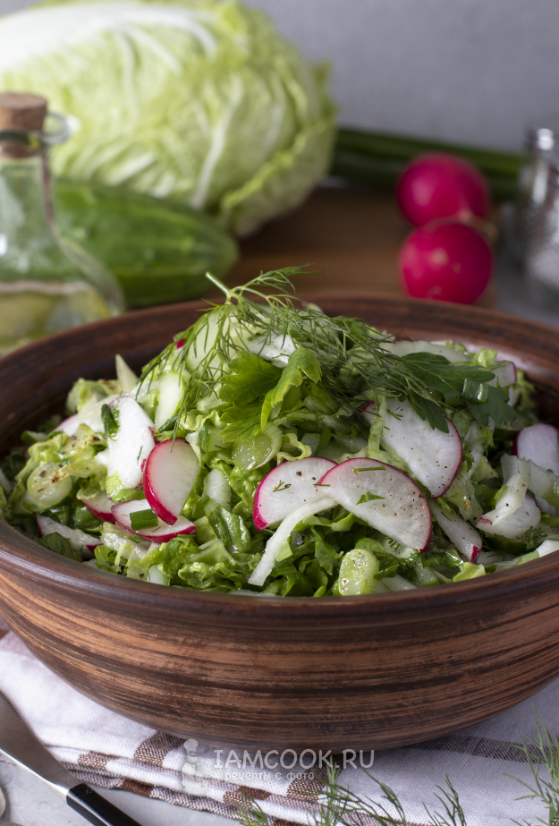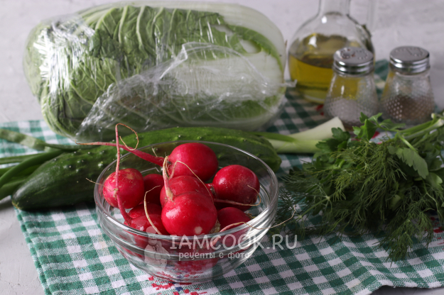 Для приготовления салата с пекинской капустой, огурцом и редиской подготовить из списка необходимые ингредиенты.