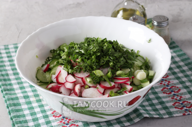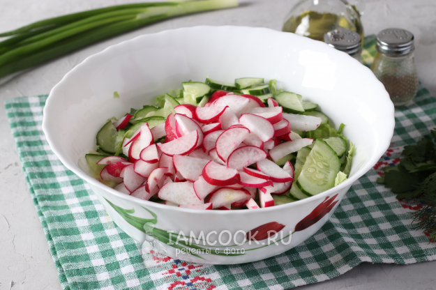 Вымыть редиску и огурцы, обрезать хвостики. Нарезать овощи тонкими полукружочками и добавить к капусте.